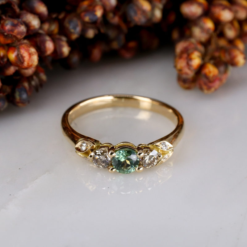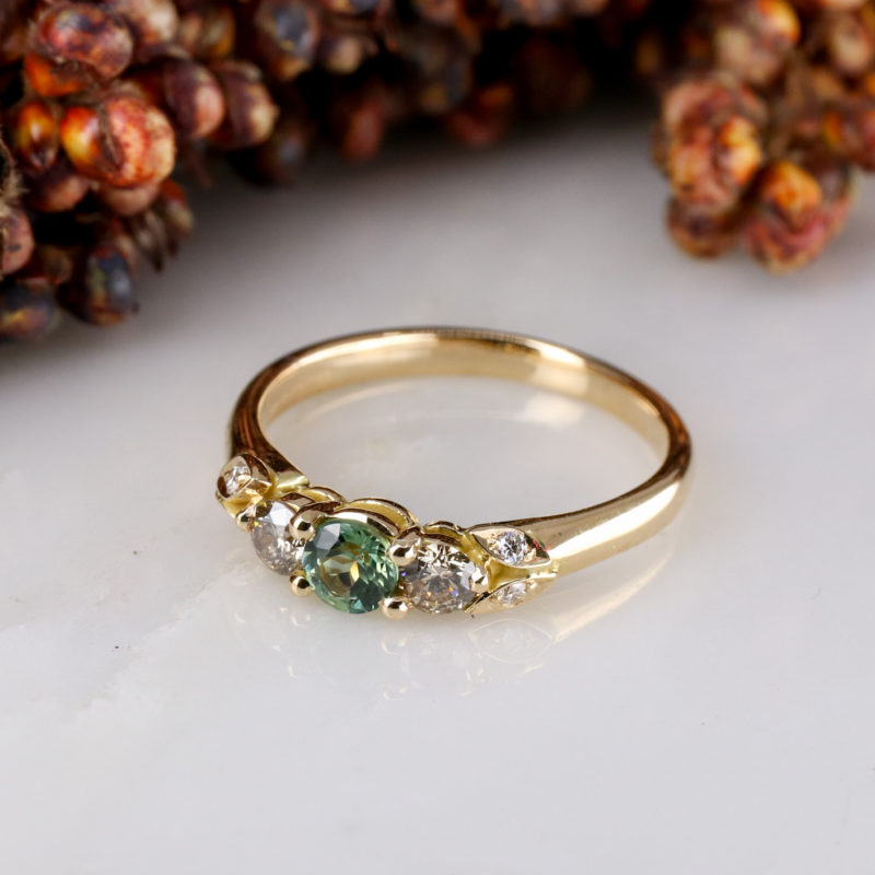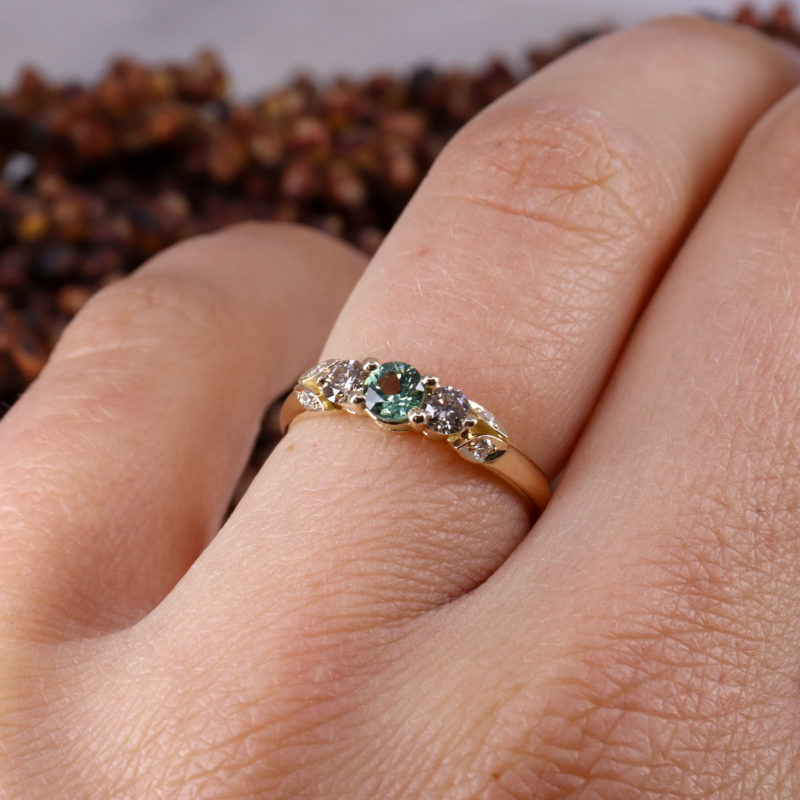 - Featuring a central teal sapphire weighing 0.29cts and two cinnamon diamonds totalling 0.21cts with small cinnamon diamond accent stones grain-set in each tiny leaf.