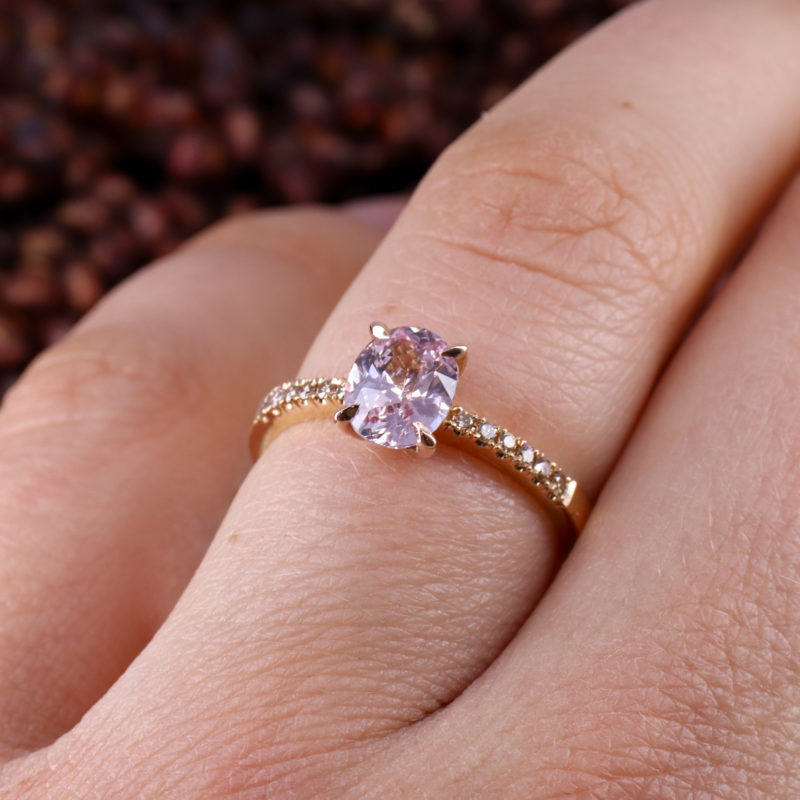 Chic and elegant, our 'Rise' collection engagement rings are simple but never boring. This beauty holds the most sublime dusky pink oval sapphire, combined with cinnamon diamonds to give a warm glow.