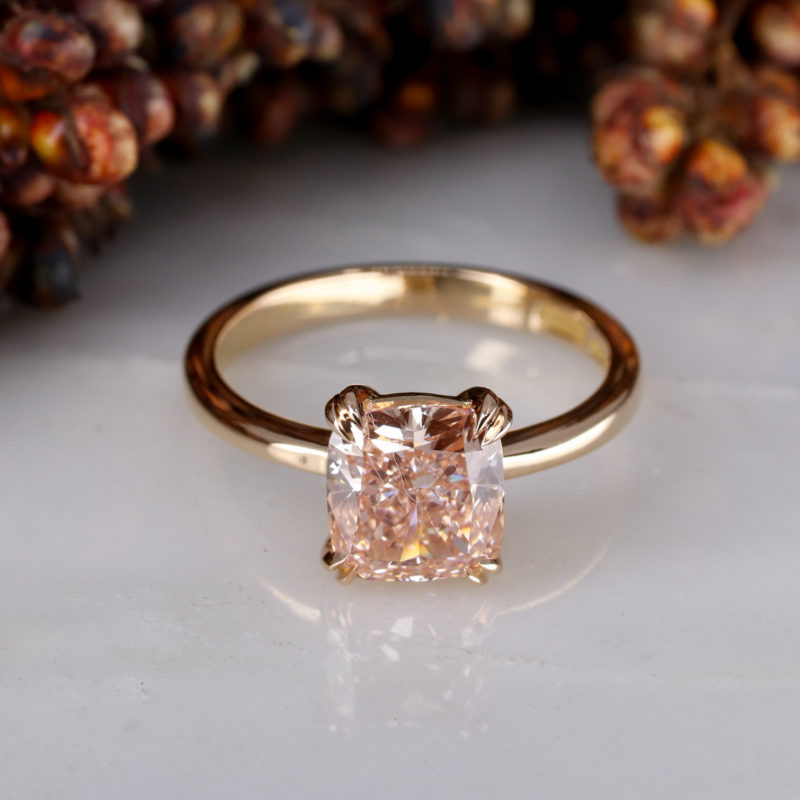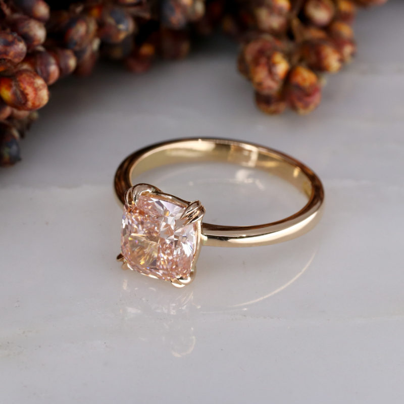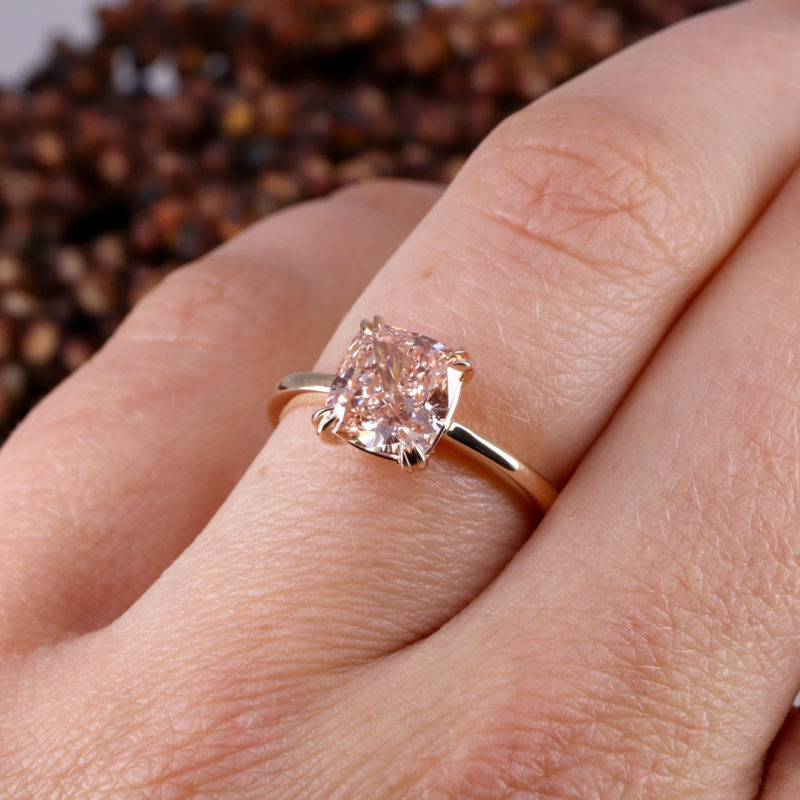 This super chic, and utterly romantic pink lab-grown cushion cut diamond needs nothing more than complimentary rose gold to shine.