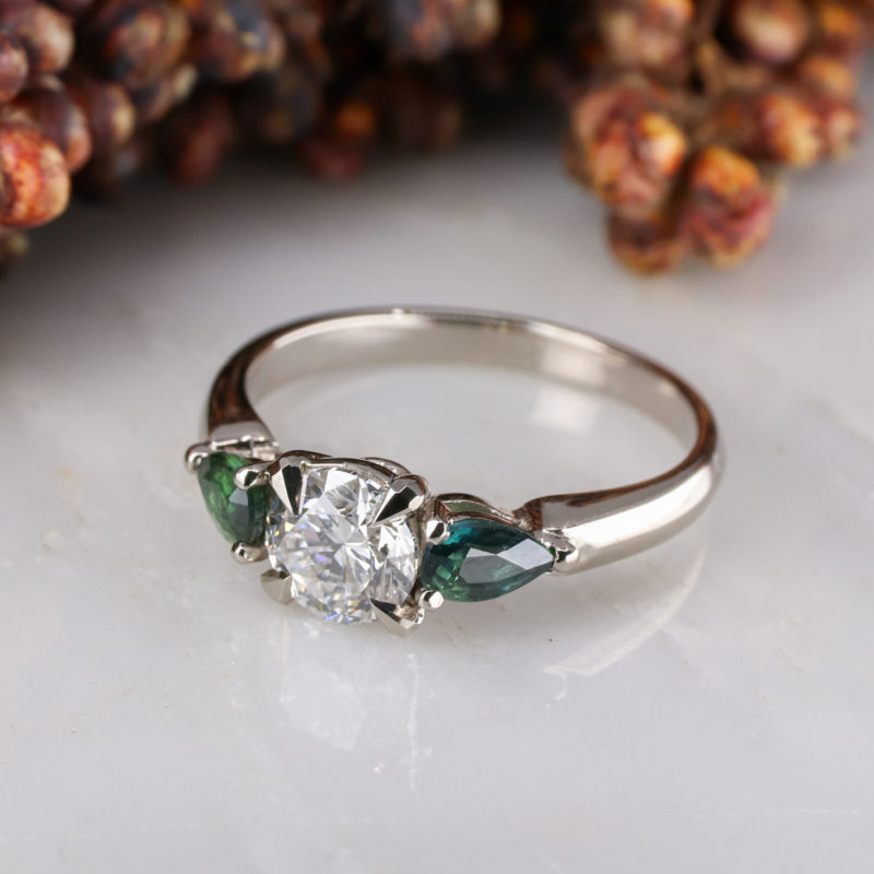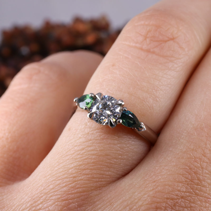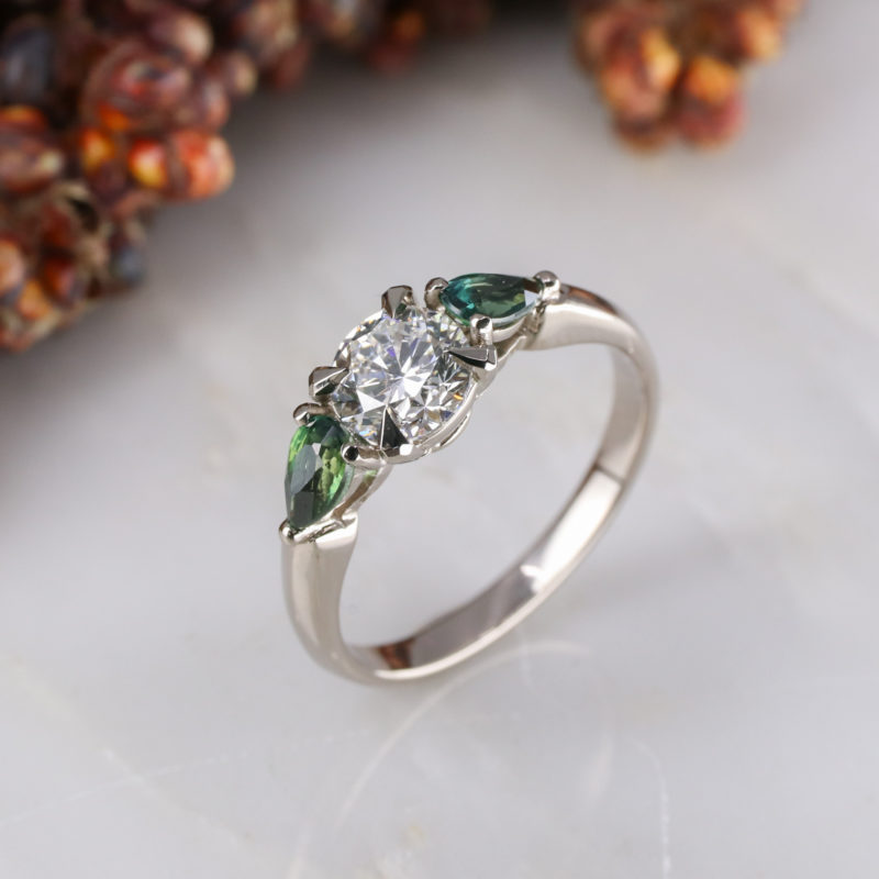 Our Coco trilogy ring mount with its sleek knife-edge shank compliments and contrasts with the fluid shapes of these beautiful round and pear shaped gemstones so harmoniously, this one featuring a stunning lab grown white diamond and teal coloured sapphires.