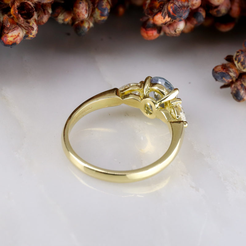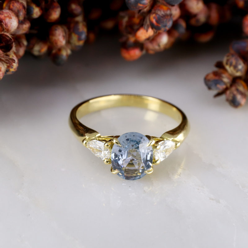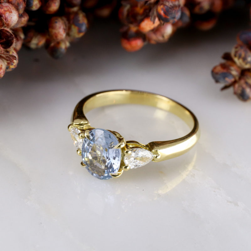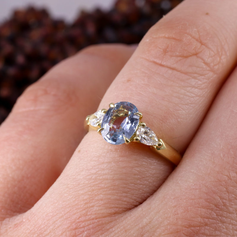 Our classic Coco trilogy ring, with a dreamy cornflower blue sapphire centre and accompanying white diamond shoulders.