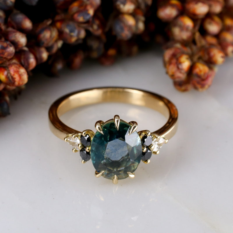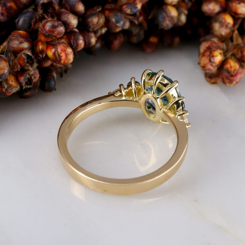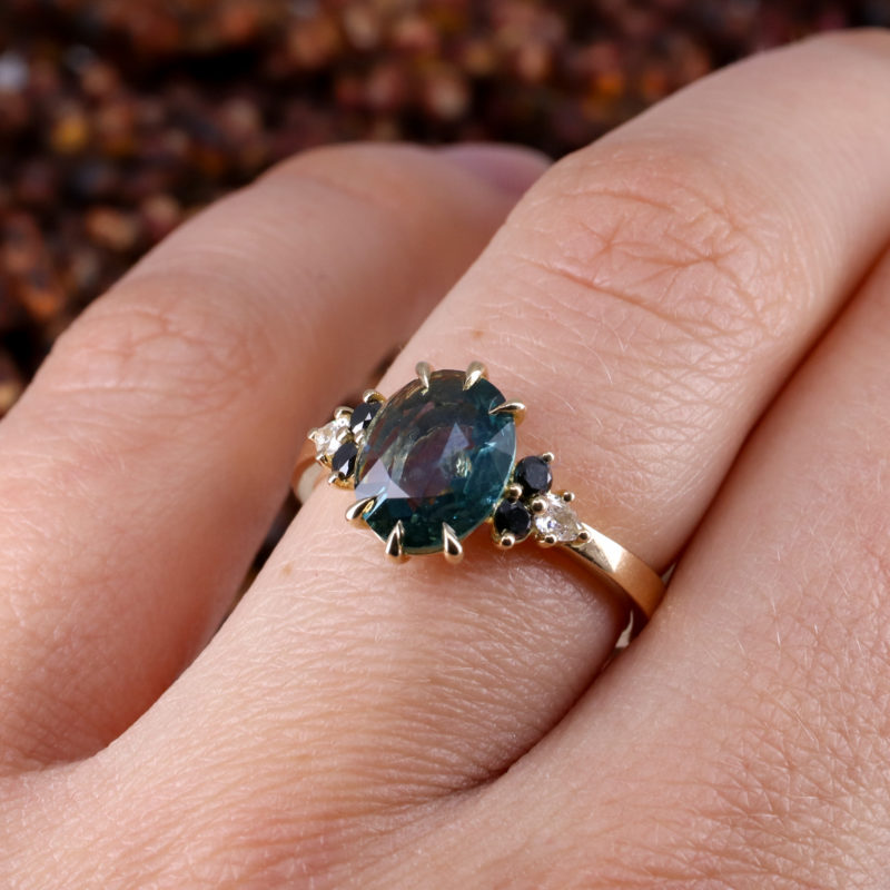 - The sapphire has a gorgeous teal colour, some slight visible inclusions and a gentle sparkle - thanks to its double-rose-cut facets.