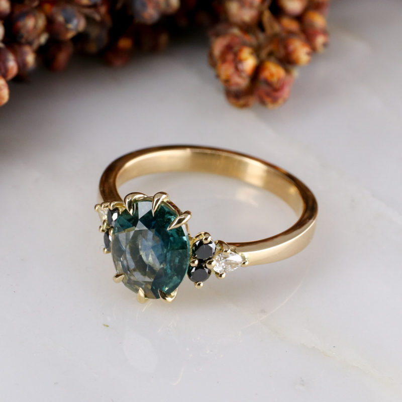 18ct yellow gold Double cut Teal sapphire Cluster engagement ring