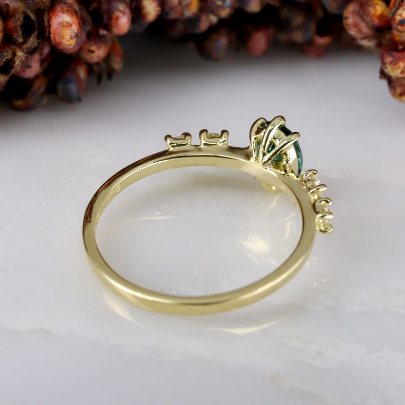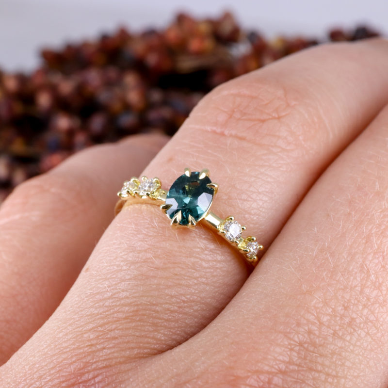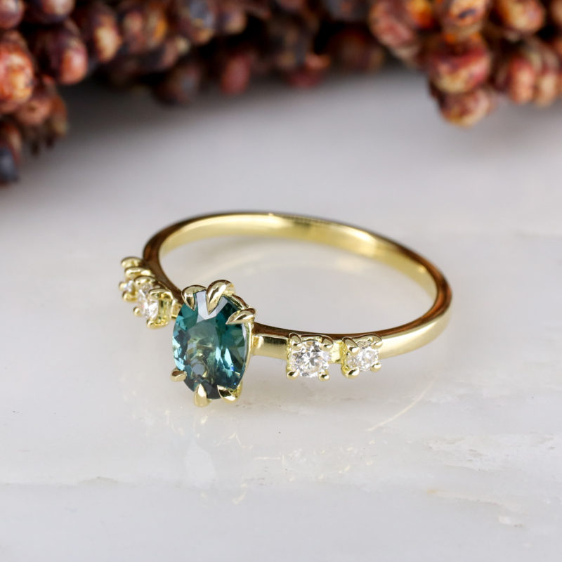 18ct yellow gold Oval Teal Sapphire and Diamond engagement ring