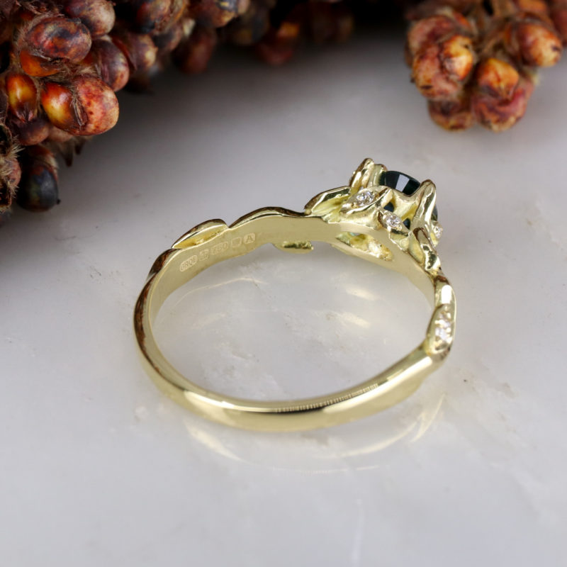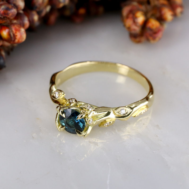 18ct yellow gold Rose and Thorn engagement ring with Teal Sapphire