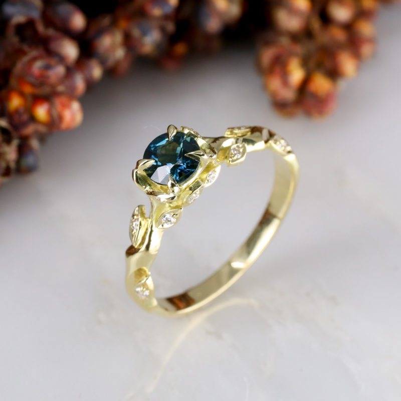 - Featuring one central 0.46ct round Teal sapphire with small white diamond accent stones grain-set in each tiny leaf.