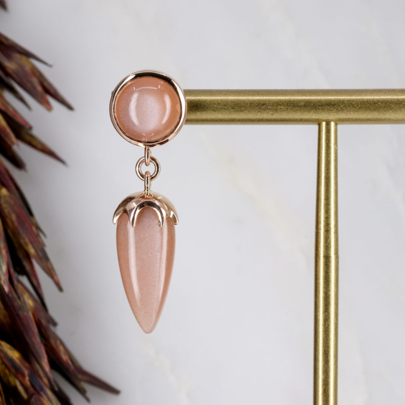 The perfect matching earrings for our beautiful Peach 'Bellini' cocktail ring - these earrings are set with a hazy peach coloured moonstone cabochon and briolette gemstones in decadent rose gold.