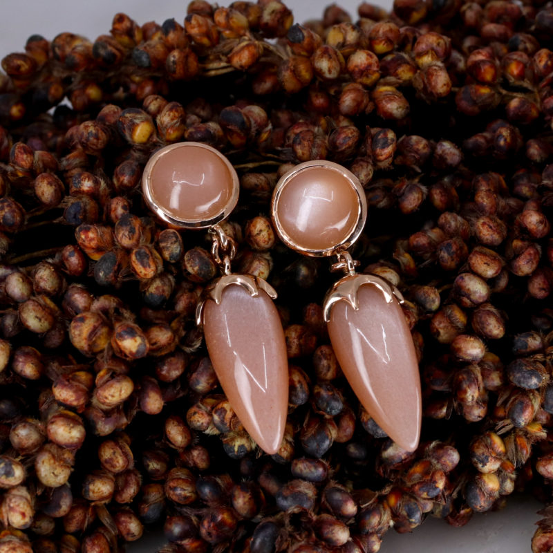 - These incredible peach moonstone drop earrings have natural iridescent qualities just like those seen in white moonstone.