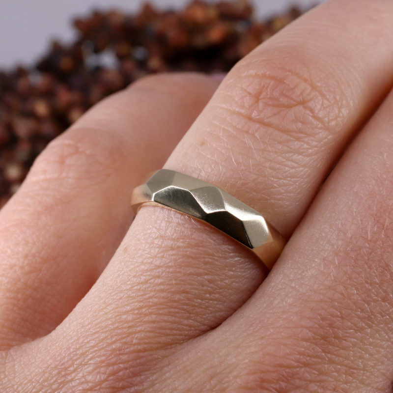 - We love the soft geometric shapes this ring has, each facet is made by hand and the ring is a magnetic finish which adds a softness.