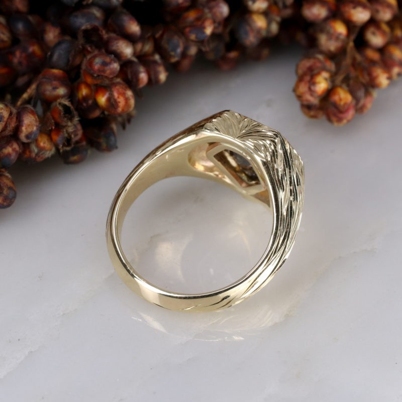 - The mount has been hand engraved in an organic tree-bark effect, which adds a tactile quality to the gold.