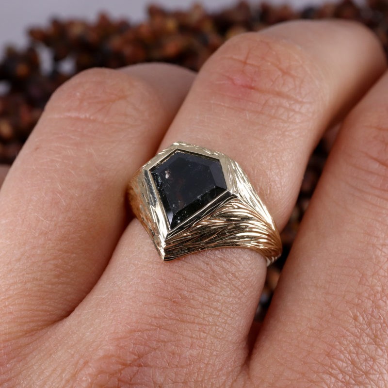 - Crafted in a signet style, this beautiful ring features a rose cut, shield shape salt and pepper diamond weighing 3.14ct.