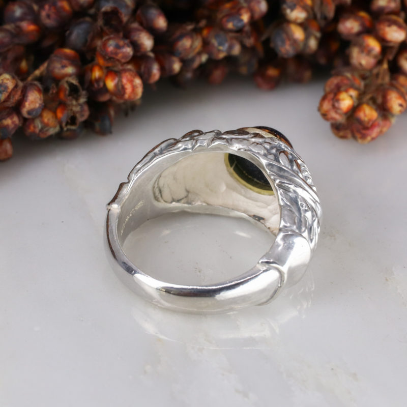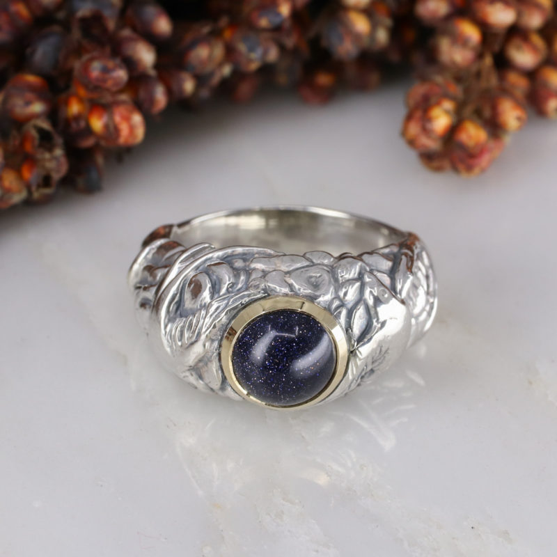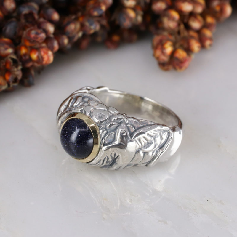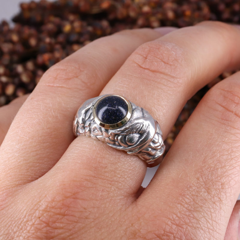 Silver and yellow gold Blue Goldstone Pirates and Swallows ring