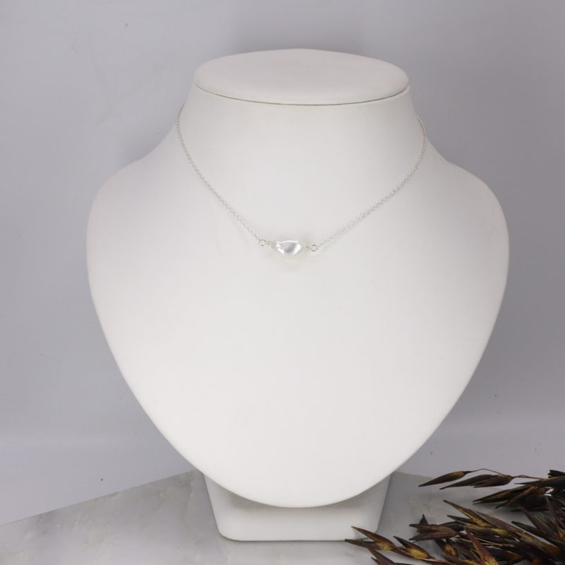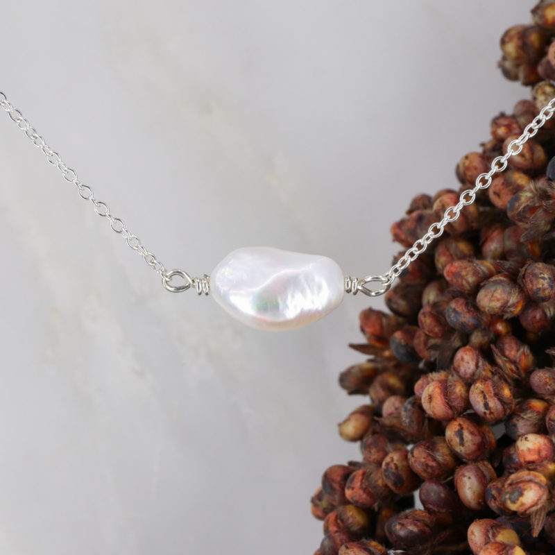A simple freeform Baroque pearl strung East/West on a fine silver chain.